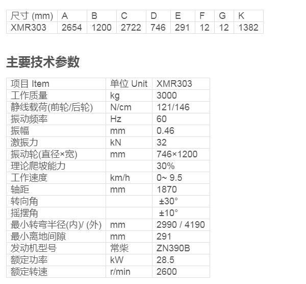 XMR303雙鋼輪振動壓路機是工作質(zhì)量為3噸的輕型振動壓路機。該機適用于瀝青工程、水泥工程等表層壓實和路緣的壓實作業(yè),也適用于底基層和基層,沙土和礫石材料的壓實作業(yè),是各種停車場施工、車行道、人行道和自行車道壓實以及各種道路維修保養(yǎng)工程中最理想的壓實機械。其特點是小振幅、高頻率,自身攜帶刮泥和灑水裝置。該振動壓路機還可以斷開振動,替代靜碾壓路機進行路面平整壓實和填土層壓實。