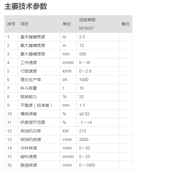 RP953T型攤鋪機是徐工大型攤鋪機中重要的機型,具有可靠的品質(zhì),超強的施工能力,優(yōu)異的工作性能和較高的性價比,是一種可廣泛應(yīng)用于高速公路基層和各種等級公路面層材料攤鋪作業(yè)的施工設(shè)備,尤其適應(yīng)于路基施工大厚度大寬度一次成型。該機采用全液壓驅(qū)動,微電腦控制,左右獨立驅(qū)動,超聲波料位傳感控制,雙振搗壓實等當(dāng)今世界最先進技術(shù),配合獨特的結(jié)構(gòu)設(shè)計,使得該機具有超厚作業(yè)能力強,攤鋪穩(wěn)定性好,預(yù)壓密實度高,路面平整度好,操作簡單舒適,維修方便快捷等優(yōu)點,該機關(guān)鍵配套件采用進口元件,使得整機制造質(zhì)量和可靠性達到同類產(chǎn)品領(lǐng)先水平,是攤鋪基礎(chǔ)穩(wěn)定材料和lumina瀝青混凝土材料的理想設(shè)備。